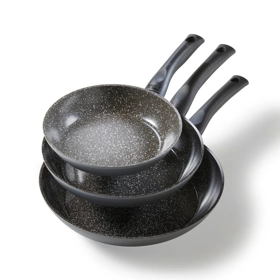 Die geniale STONELINE Beschichtung nun auch in Keramik-Ausführung!Gesundes, vitaminschonendes Kochen mit wenig Fett Dieses Pfannen-Set ist ideal für alle Brat- und Schmorgerichte! Bereiten Sie knusprige Bratkartoffeln, leckeres Gemüse, luftige Eierspeisen und kross gebratenes Fleisch oder Schnitzel zu. Dank der extrem harten, langlebigen STONELINE CERAMIC Beschichtung mit Lotus Abperl-Effekt werden Sie zukünftig noch mehr Freude beim Zubereiten Ihrer Speisen haben! Hierbei spielt es keine Rolle, ob Sie auf Glaskeramik, Induktion, Elektro oder Gas kochen. Dieses 3-teilige Set besteht aus: 1 Bratpfanne, ø ca. 20 cm, Höhe: ca. 4,3 cm, ca. 1,0 l, Induktionsboden: ø ca. 14 cm1 Bratpfanne, ø ca. 24 cm, Höhe: ca. 4,7 cm, ca. 1,65 l, Induktionsboden: ø ca. 17,7 cm1 Bratpfanne, ø ca. 28 cm, Höhe: ca. 5 cm, ca. 2,4 l, Induktionsboden: ø ca. 21,8 cm Die wichtigsten Vorteile des STONELINE CERAMIC Kochgeschirrs auf einen Blick: Kratzfeste STONELINE- Keramikbeschichtung Optimales Bratergebnis und kross gebratenes Fleisch Bester Geschmack Vitaminschonend kochen und braten mit wenig Fett und Öl Kein Anbrennen und kein Ankleben Super leicht zu reinigen Für alle Herdarten geeignet, auch Induktion Extra starker, verzugsfreier Boden Beschichtung hitzebeständig bis 450 °C Zum Flambieren geeignet Bodenstärke: 2,8 mm Backofengeeignet bis 180 °C Material: AluminiumPFAS frei Reinigungs- und Pflegetipps: Vor dem ersten Gebrauch empfehlen wir, Ihr Koch- oder Backgeschirr mit etwas Wasser und einem milden Spülmittel gründlich auszuwaschen.Verteilen Sie anschließend mit einem Papierküchentuch einige Tropfen Speiseöl auf der Beschichtung.Dank dem Easy-Clean-Effekt wird die Reinigung per Hand empfohlen. Einfach mit heißem Wasser, Handspülmittel und einem weichen Schwamm auswischen.
