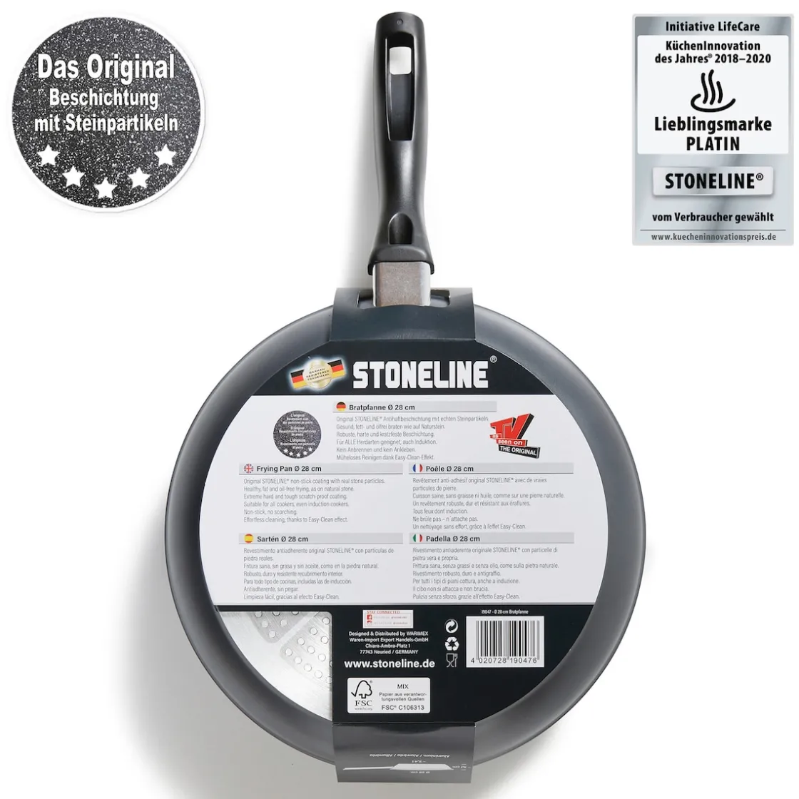 STONELINE Made in Germany!Gesund fettfrei kochen und braten! Die perfekte Größe bietet diese 28 cm Pfanne.Bereiten Sie darin große oder kleine Mengen zu. Dank der speziellen STONELINE-Antihaftbeschichtung lassen sich Ihre Speisen – je nach Wunsch – mit oder ohne Bratfett und Ol zubereiten und ganz ohne Ankleben aus dem Kochgeschirr lösen. Hierbei spielt es keine Rolle, ob Sie auf Glaskeramik, Induktion, Elektro oder Gas kochen. In Kochgeschirr mit der original STONELINE-Beschichtung bleiben keine hartnäckigen Reste haften und die einfache Handwäsche spart Ihnen Zeit und Mühe. 1 Bratpfanne, ø ca. 28 cm, Höhe: ca. 5,1 cm, ca. 2,4 l Die wichtigsten Vorteile des STONELINE Kochgeschirrs auf einen Blick: Weltweit einzige Antihaftbeschichtung mit echten Steinpartikeln Kratzfeste STONELINE-Antihaftbeschichtung Vitaminschonend kochen und braten ohne Fett und Ol Optimales Bratergebnis und kross gebratenes Fleisch Auch für Vegetarier geeignet: Gemüse bleibt knackig und saftig Kein Anbrennen und kein Ankleben Super leicht zu reinigen Extra starker, verzugsfreier Boden Bodenstärke: 4,5 mm Für alle Herdarten geeignet, auch Induktion Dieses Produkt ist backofengeeignet bis 180 °C Material: Aluminium geschmiedet Reinigungs- und Pflegetipps: Vor dem ersten Gebrauch empfehlen wir, Ihr Koch- oder Backgeschirr mit etwas Wasser und einem milden Spülmittel gründlich auszuwaschen.Verteilen Sie anschließend mit einem Papierküchentuch einige Tropfen Speiseöl auf der Beschichtung.Bei der weiteren Nutzung können Sie auf den Einsatz von Fett oder Ol verzichten!Dank dem Easy-Clean-Effekt wird die Reinigung per Hand empfohlen. Einfach mit heißem Wasser, Handspülmittel und einem weichen Schwamm auswischen.