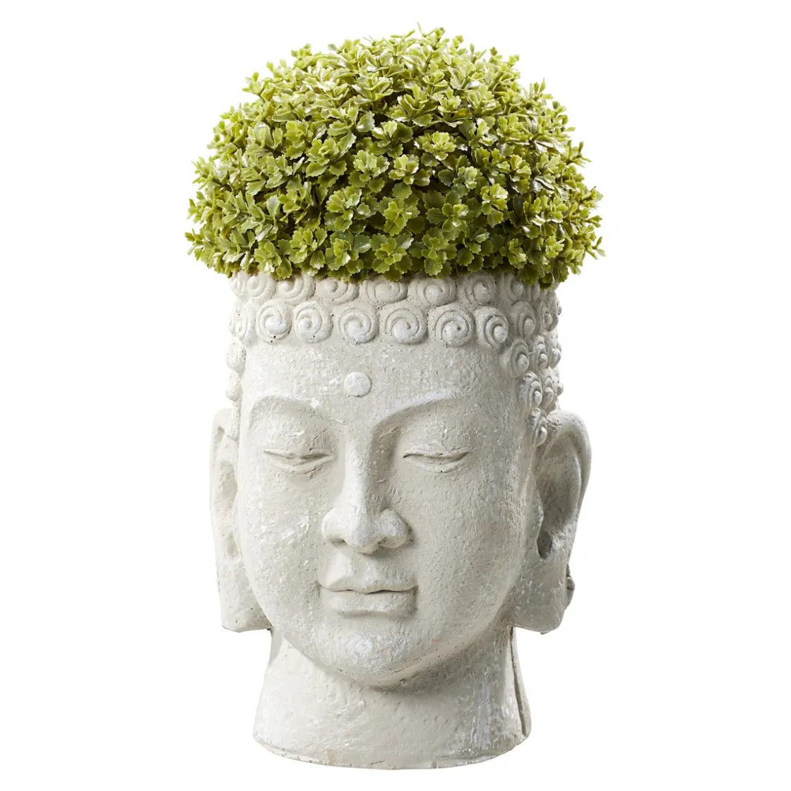 Dieser wetterfeste und kunstvoll gestaltete Buddhakopf entlockt Ihren Gästen nicht nur bewundernde Blicke, sondern sorgt auch für fernöstliches Flair im eigenen Garten. Die mitgelieferte Buchsbaumkugel kann – je nach Saison – ausgetauscht und z. B. mit Geranien bepflanzt werden.