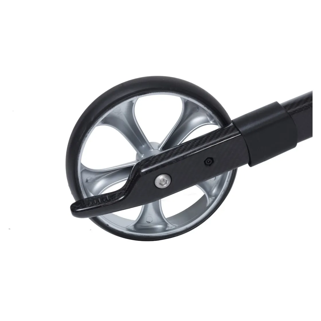 Praktische Details sind die reflektierenden Außennähte der Tasche und die innenliegenden Seitentaschen, die sich teilweise mit Reißverschluss sichern lassen. Die Nummerierung auf der Innenseite der Schiebegriffe ermöglicht ein leichtes Wiederfinden der benötigten Griffhöhe. Große Schraubköpfe erleichtern die Arretierung der Höhenverstellung. Leichter Faltmechanismus mit integrierter, magnetischer Faltsicherung. Durch den Carbonrahmen ist er besonders leicht und stark belastbar zugleich.