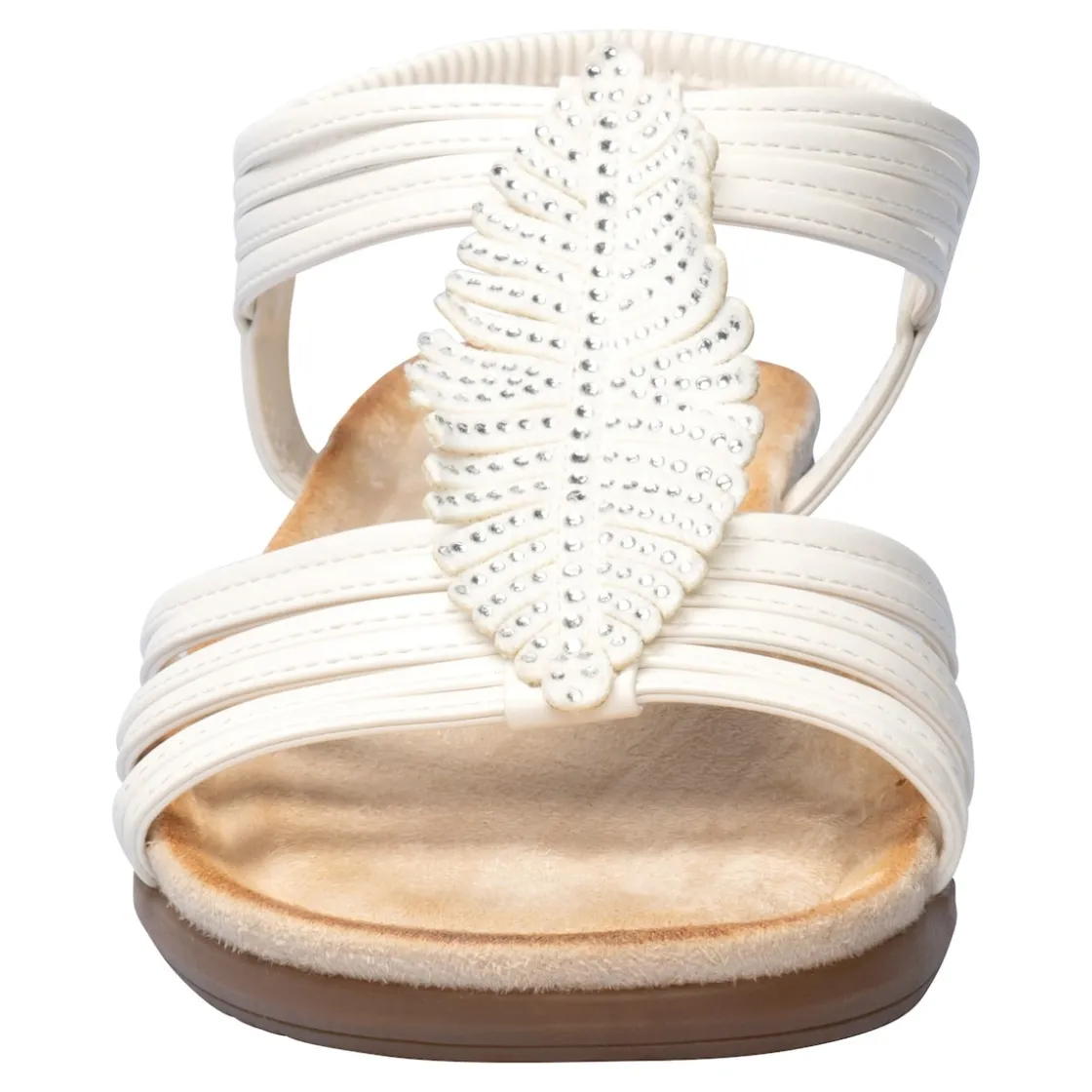 Mit Leichtigkeit in den Sommer! Diese Sandale mit weicher Decksohle macht ihrem Namen alle Ehre. Den Rist ziert eine filigrane Federapplikation mit Glitzersteinchen, die in der Sonne funkeln. Dank elastischem Riemchen an der Ferse ist sie schnell an- und ausgezogen und schenkt Ihnen den ganzen Tag höchsten Tragekomfort. Mit rutschhemmender Laufsohle.