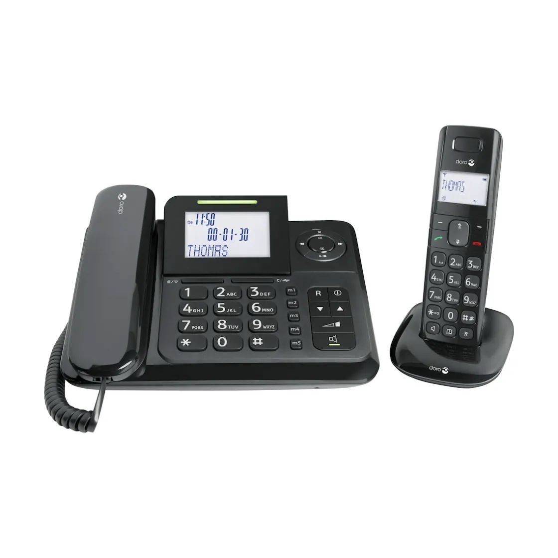 Bietet die Flexibilität eines schnurlosen Telefons und den Komfort eines schnurgebundenen Telefons. Dank der DECT-Basiseinheit, die im schnurgebundenen Telefon integriert ist, wird nur eine kleine und praktische Ladestation für das schnurlose Telefon benötigt. Beide Hörer liegen gut in der Hand. Mit gutem klarem Klang. Schnurgebundenes Basisteil mit Lautstärke-Verstärkertaste. Große, leicht ablesbare Displays mit Hintergrundbeleuchtung. Anruf-Weiterleitung von Basis zu Mobilteil und umgekehrt möglich.
