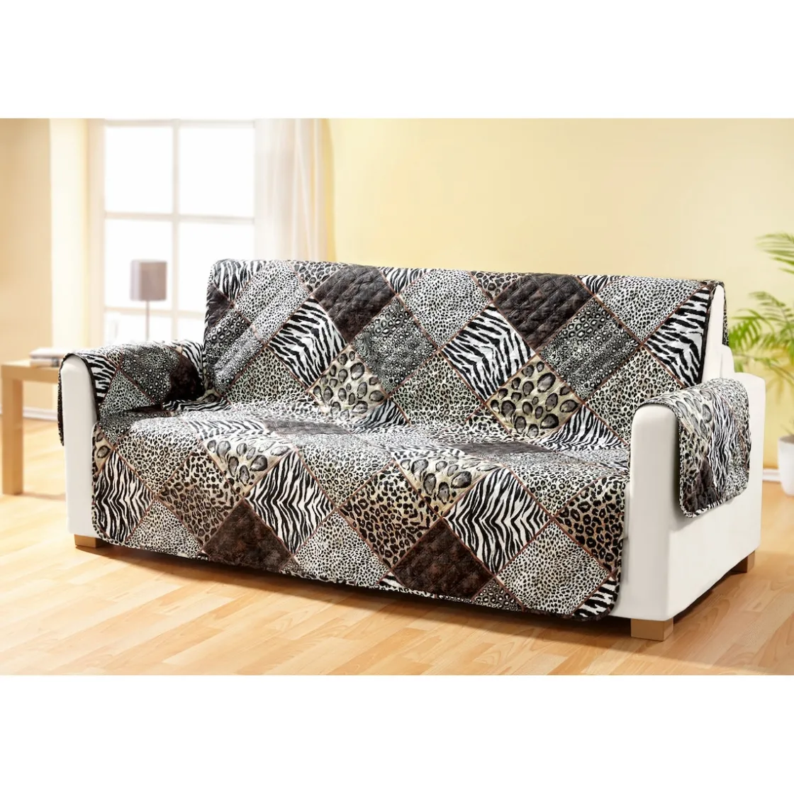 Werten Sie Sitzmöbel auf und schützen Sie damit auch den Bezugsstoff Ihrer Möbel vor Schmutz und Abnutzung. Attraktiver Wendebezug mit Safari-Patch-Muster und unifarbener dunkelbrauner Seite.