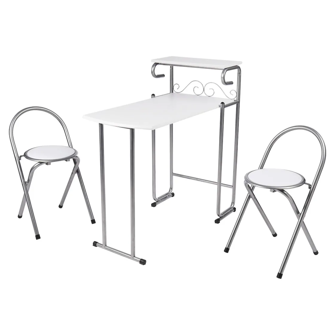 Einfach die Stühle aufklappen und bequem hinsetzen, alleine oder zu zweit! Dieser clevere Tisch mit passenden Klappstühlen passt überall hin und ist schnell wieder platzsparend verstaut.