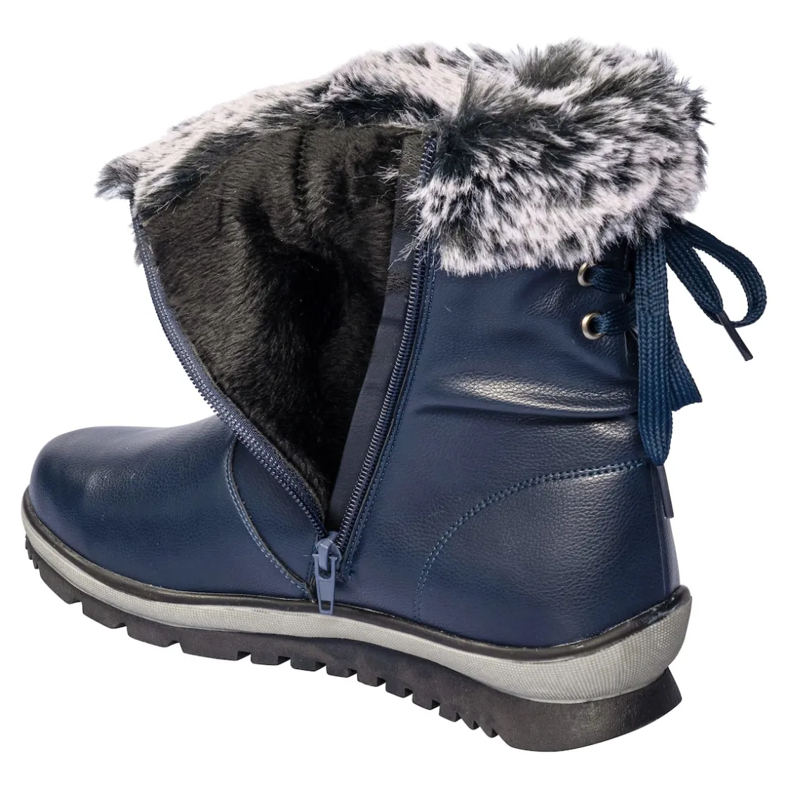 Der attraktive Winterstiefel in Leder-Optik mit Reißverschluss überzeugt an kalten Tagen mit warmem Futter, üppigem Kunstfellrand und weicher Decksohle. Der Reißverschluss auf der Innenseite ermöglicht einen mühelosen Ein- und Ausstieg. Die Schnürung am hinteren Schaft sorgt für den perfekten Sitz, auch bei stärkeren Waden. Mit zweifarbiger Gummi-Profil-Laufsohle.