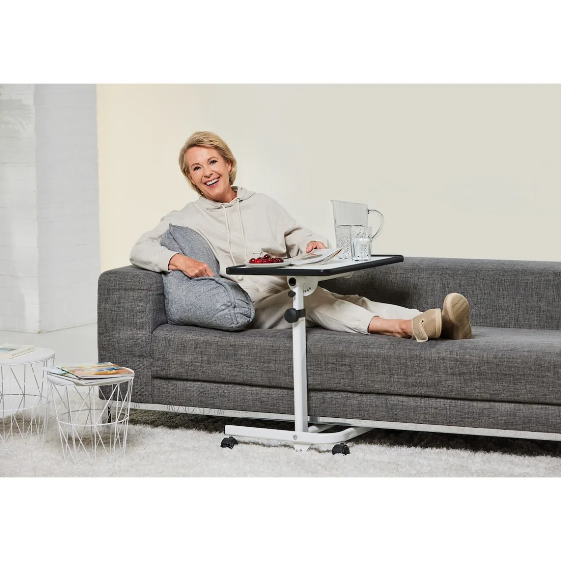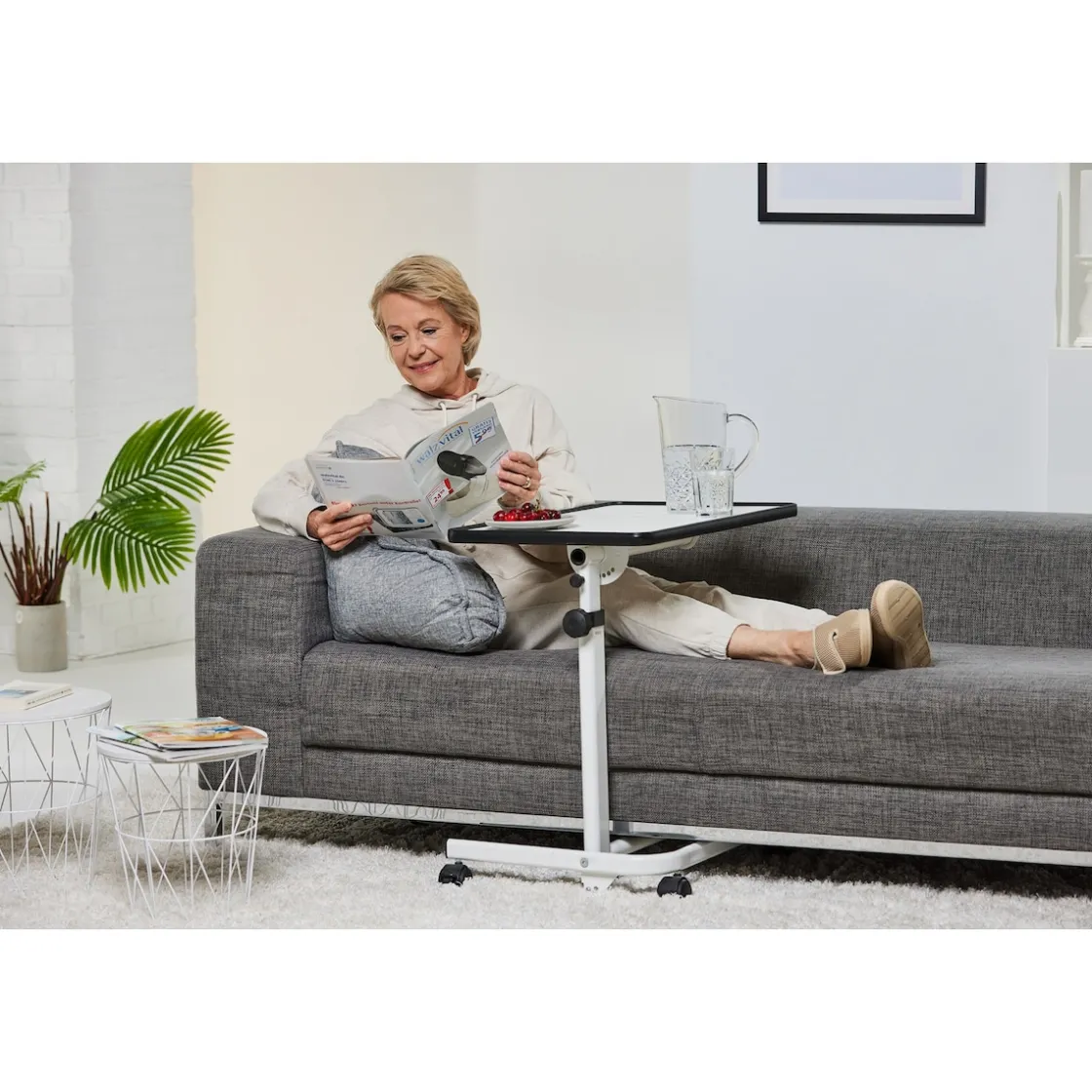 Der mobile Beistelltisch ist ideal, wenn Sie sich im Alltag mehr Komfort wünschen. Mit seinem durchdachten Fußteil und den vier Leichtlaufrollen lässt sich das praktische Möbelstück leicht manövrieren und unter das Bett schieben. So haben Sie die 40 x 60 Zentimeter messende Tischplatte in voller Größe vor sich und zur freien Verfügung. Den Platz können Sie zum Beispiel zum Lesen und Schreiben oder als Ablage für Fernbedienungen, Medikamente oder Ihre Brille nutzen. Auch ein Laptop oder Tablet findet auf der Tischplatte Platz. So haben Sie die Möglichkeit, vom Bett aus im Netz zu surfen und mit Familie und Freunden in Kontakt zu bleiben. Selbstverständlich können Sie den mobilen Tisch auch als Nachttisch oder um Mahlzeiten im Bett zu sich zu nehmen nutzen.