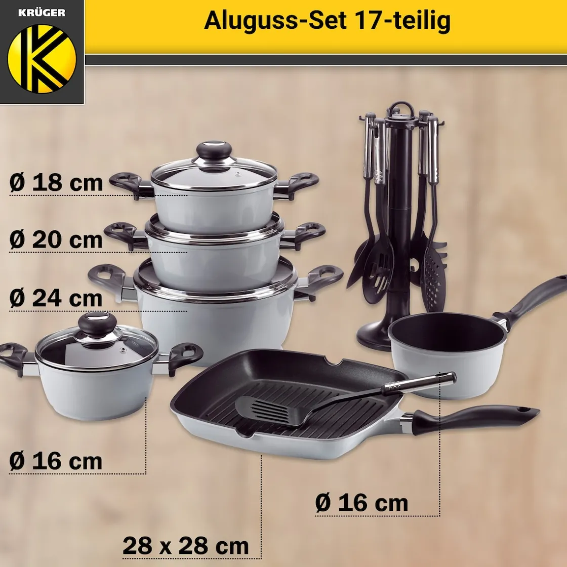 Das 17-teilige Aluguss-Topfset macht gesundes Kochen zum Kinderspiel. Die Töpfe und die Steakpfanne bestehen aus robustem Aluguss und sind mit komfortablen Kunststoffgriffen ausgestattet. Dank der hochwertigen Antihaft-Beschichtung benötigen Sie nur wenig Fett, was Ihre Gerichte besonders gesund macht. Die schwere Qualitätsausführung sorgt für eine optimale Wärmeverteilung und langanhaltende Wärmespeicherung. Die Töpfe sind hitzebeständig bis 180°C (mit Deckel bis 160°C) und spülmaschinenfest, was die Reinigung erleichtert. Zusätzlich enthält das Set sechs praktische Küchenhelfer und einen Ständer, die Ihnen die Zubereitung Ihrer Gerichte erleichtern. Geeignet für alle Herdarten außer Induktion.