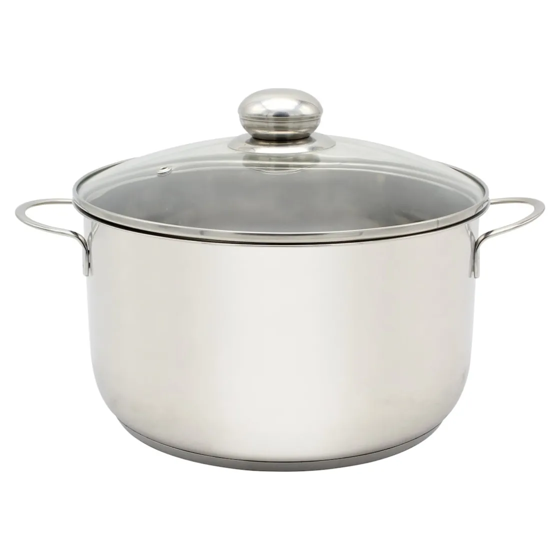 Topf aus rostfreiem Edelstahl der Serie Saturn. Glasdeckel mit Edelstahlschutzrand und Lüftungsloch. Geeignet für alle Herdarten auch für Induktions-Kochfelder.