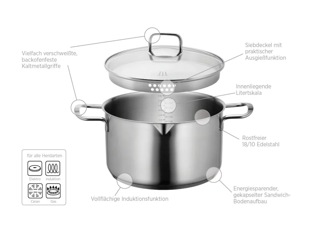 Kochen mit hochwertigem und vor allem gut durchdachtem Kochgeschirr erhöht den Spaßfaktor enorm. Die Kochtopf-Serie Sanvito lässt keine Wünsche offen, wenn es um clevere Kochlösungen auf dem Herd geht. Die Edelstahltöpfe haben einen praktischen Ausgießer und eine Literskala. Garflüssigkeit abmessen vor Kochbeginn und abseihen nach Ende des Kochvorgangs sind damit ganz ohne weitere Hilfsmittel möglich. Durch den robusten Glasdeckel können Sie zu jeder Zeit beobachten, was im Topfinnern passiert.