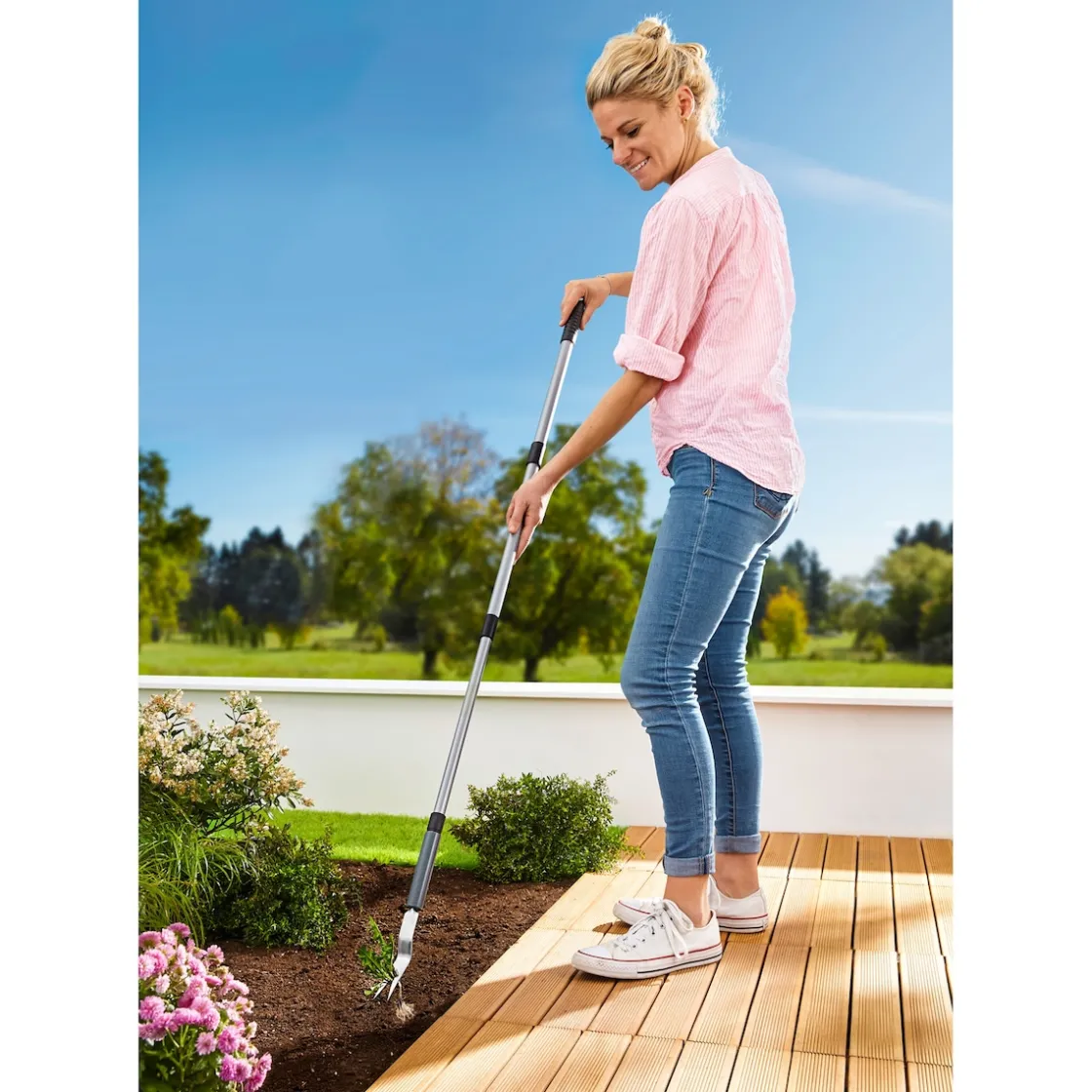 Lästiges Wurzelunkraut, wie Löwenzahn, Brennnessel, Distel oder Ähnliches, erfordern ein tiefes Einstechen in den Boden. Mit dem Unkrautstecher geht das ganz einfach. Die angewinkelte Form des Zinkens ermöglicht eine effektive Hebelwirkung. Ergonomischer Handgriff. Teleskopstiel verstellbar von 55 – 120 cm.