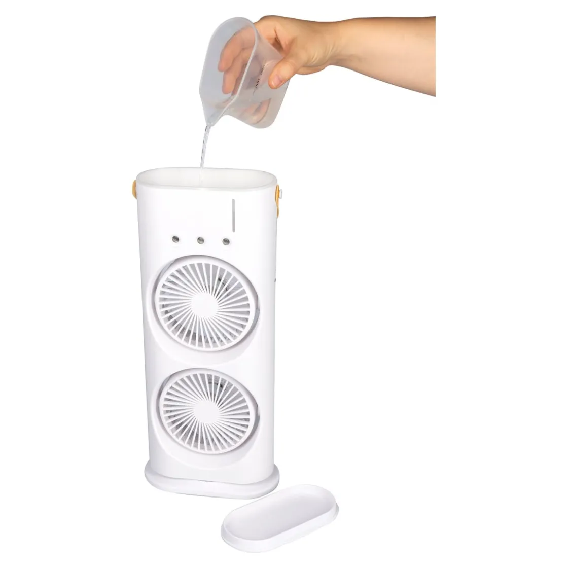 Hitzewelle in Sicht? Kein Problem! Mit diesem Premium-Luftkühler genießen Sie stets frische, kühle Luft. 2 individuell einstellbare Ventilatoren und 3 Sprühdüsen sorgen für eine angenehme Raumluft und befeuchten sie mit einem feinen Wassernebel. Cooles Extra: Die LED-Lichter mit Farbwechsel schaffen ein stimmungsvolles Ambiente. Inkl. Fernbedienung und USB-Ladekabel.