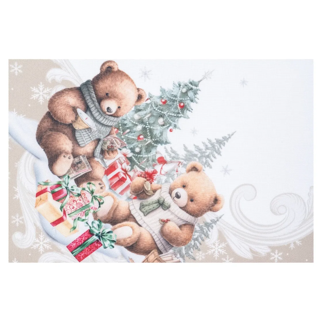 Die Mitteldecke „Teddy Bescherung“ bringt festliche Freude auf Ihren Tisch! Mit niedlichen Teddys, die die Weihnachtsstimmung perfekt einfangen, wird jede Mahlzeit zum Fest. Das charmante Design verleiht Ihrer Tafel eine warme und einladende Atmosphäre, ideal für die Adventszeit und Weihnachtsfeierlichkeiten. Bringen Sie mit dieser Decke Gemütlichkeit und Freude in Ihr Zuhause!