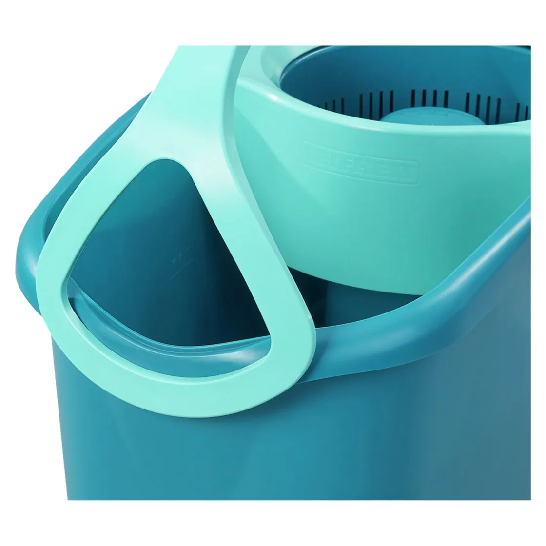 Der Teleskopstiel mit Drill-Mechanik ermöglicht ein bequemes Ausschleudern des Wischmopps im Stehen – ganz ohne großen Kraftaufwand und ohne Hände im Schmutzwasser. Durch Druck des Stiels wird das Schleudersieb des Eimers in Gang gebracht und Schmutzwasser sowie Schmutz werden wirkungsvoll aus dem Mopp geschleudert. Mithilfe der Schleuder-Stopp Funktion lässt sich der Feuchtigkeitsgrad des Mopps individuell und entsprechend der Pflegeansprüche des Bodens mühelos bestimmen. Um den Schleudervorgang zu stoppen, muss lediglich der Hebel am Stiel des Wischmopps geschlossen werden. Der neue Eimer garantiert ein ruhiges und sicheres Schleudern.